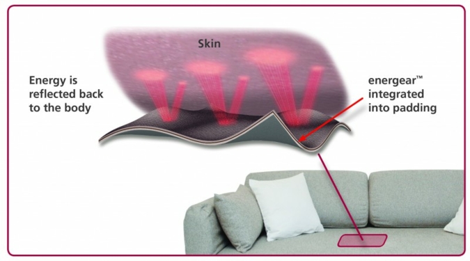 Die energear-Ausrüstung von Schoeller Technologies gewinnt nun auch im Bereich von Möbel- und Matratzenstoffen an Interesse. energear reflektiert die körpereigene Energie, welche in Form von Ferninfrarotstrahlen abgegeben wird, wieder zurück an den Körper. Dies kann sich positiv auf das Wohlbefinden auswirken.